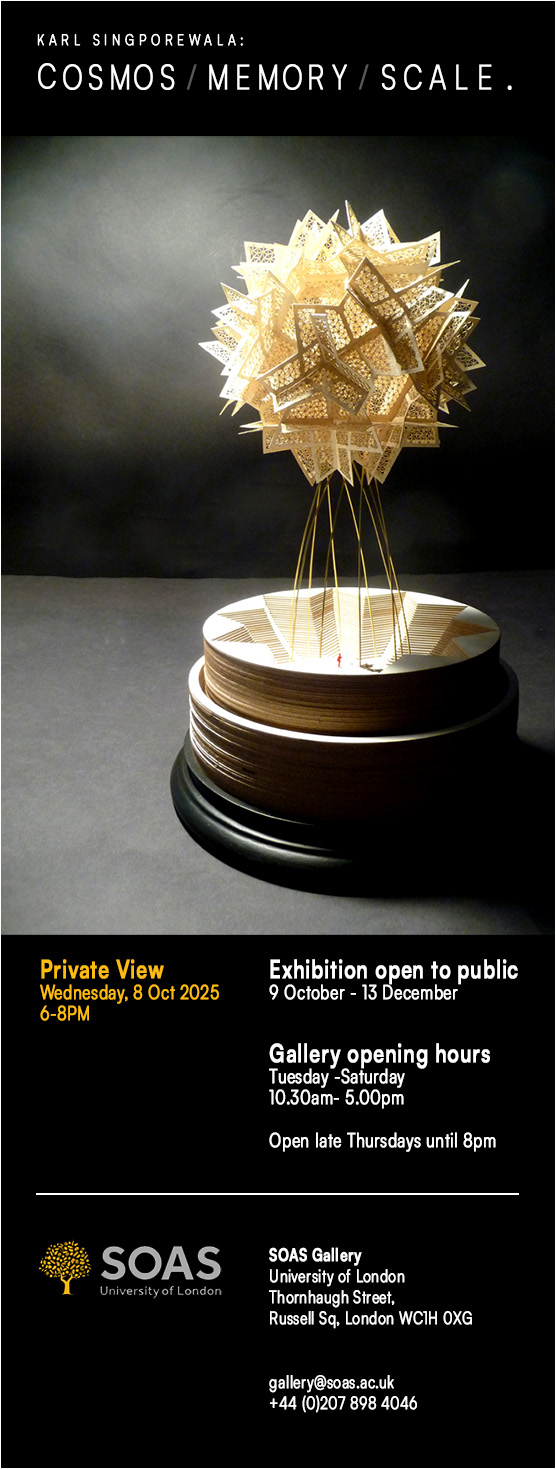 The 2025 SOAS Artist-in-Residence Fellowship of the Shapoorji Pallonji Institute of Zoroastrian Studies presents a new major solo exhibition of Karl Singporewala’s sculptural works linked to Zoroastrian symbolism. The exhibition features large-scale installations with new and past artworks from the artist’s catalogue which explore his heritage through art and architectural form. It will also showcase historic objects on loan from cultural institutions and private collectors.